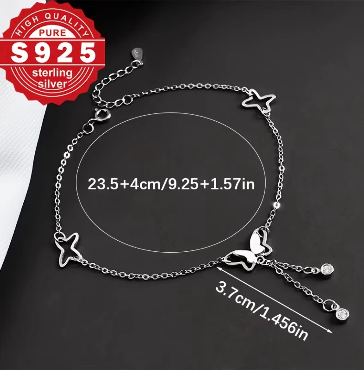 1pc S925 Sterling Silver Anklet with Butterfly & Tassel Design, Synthetic Synthetic Zirconia Accents – Elegant Summer Beach Jewelry for Vacation, Music Festivals, Casual Attire, Vacation Accessory, Festive Accessory, Durable Accessory