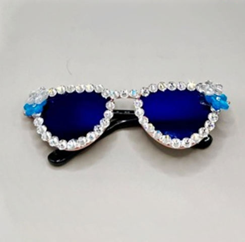 Pet Sunglasses with White Rhinestones and White/Blue Flower Accents. Comes with two strands of elastic to attach under the chin and behind the head.